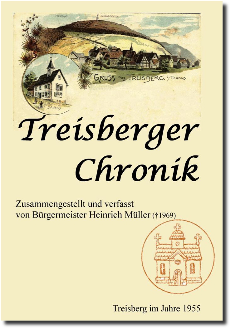 Die Treisberger Ortschronik wurde seinerzeit von Bürgermeister Heinrich Müller (gest. 1969) im Zeitraum 1954-1955 zusammen-gestellt und verfasst. In einer Gemeindevertretersitzung des Jahres 1954 erging der Beschluß, für den kleinen Ort rückwirkend eine Chronik zu erstellen, mit dessen Weiterführung dann der jeweilige Lehrer des Dorfes betraut werden sollte. Die Urfassung wurde vom Gemeindeschreiber Adolf Wick handschriftlich in ein eigens ange- schafftes, schweinsledergebundenes Buch niedergeschrieben.