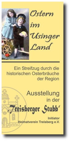 Der Heimatverein Treisberg e.V. präsentierte am 13. / 20. / 27. & 28. März eine Ausstellung zum Thema: "Ostern im Usinger Land". Man möchte glauben, dass sich die volkstümlichen Sitten und Gebräuche des Usinger Landes nicht sonderlich voneinander unterscheiden. Weit gefehlt, Dörfer die nur wenige Kilometer voneinander entfernt liegen, praktizierten oftmals ihre jahreszeitlichen Brauchtümer durch- aus unterschiedlich. Die Ausstellung in Treisberg zeigte am Beispiel der regionalen, historischen Osterbräuche die unterschiedlichen Aus- führungen.